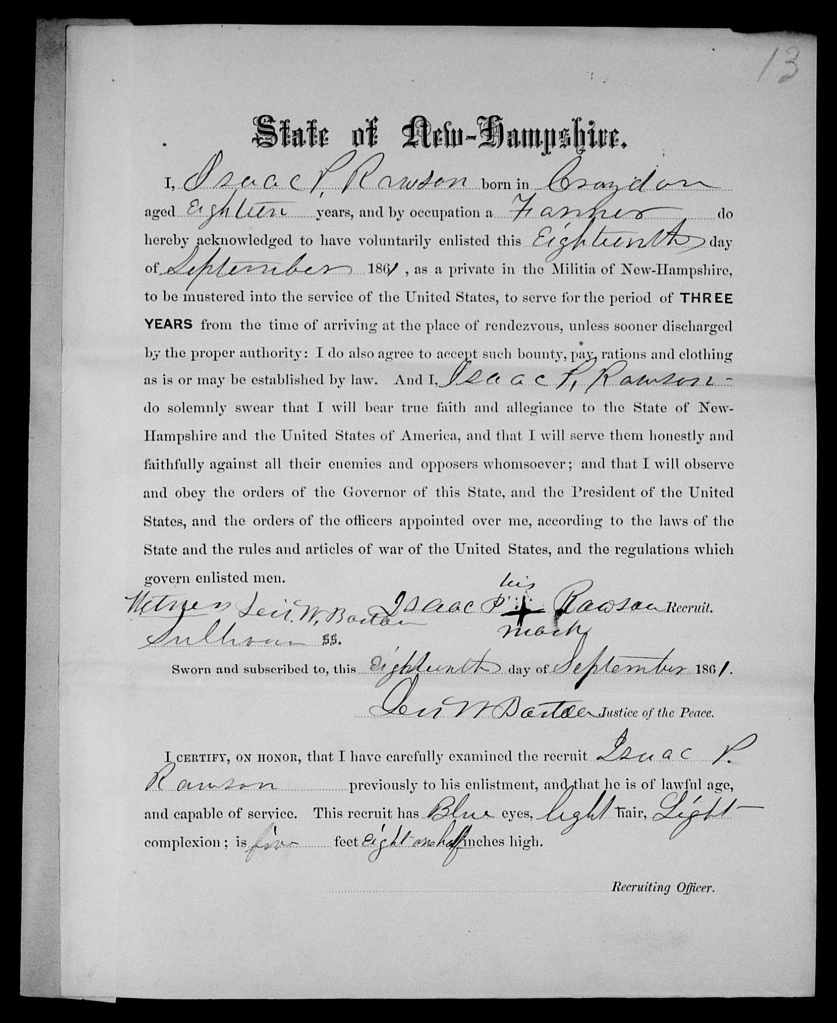 Enlistment Form for Isaac P. Rawson (1861): Rawson, who was presumably illiterate, made “his mark” on this enlistment form. Levi Barton, who signed the form as a Justice of the Peace, also witnessed Rawson’s mark. Barton was the father of Ira Barton, who became the Captain of Company E, in which Rawson served. Rawson was only 16 when he enlisted.