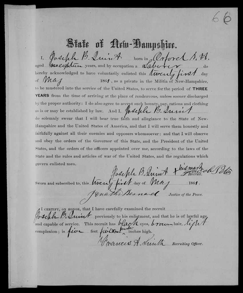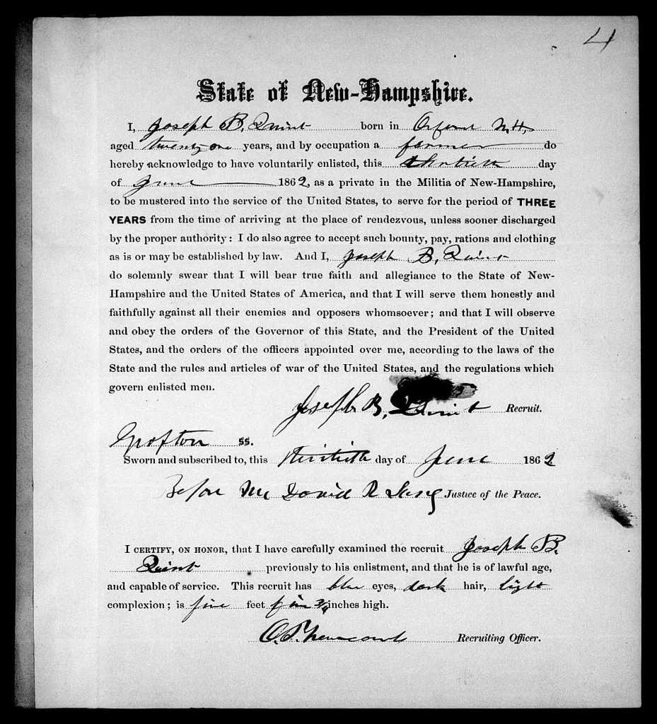 [ii] Quint eventually found his way into the 9th New Hampshire. He died of disease in April 1863 at Point Lookout, MD. “New Hampshire, Civil War Service and Pension Records, 1861-1866,” database with images, FamilySearch (https://familysearch.org/ark:/61903/1:1:Q2Q1-BHQQ : 16 March 2018), Joseph B Quint, 21 May 1861; citing New Hampshire, United States, New Hampshire Secretary of State, Division of Records Management & Archive; FHL microfilm 2,257,028.; “New Hampshire, Civil War Service and Pension Records, 1861-1866,” database with images, FamilySearch (https://familysearch.org/ark:/61903/1:1:Q2Q1-YNRZ : 16 March 2018), Joseph B Quint, 14 Sep 1861; citing Grafton, Grafton, Grafton, New Hampshire, United States, New Hampshire Secretary of State, Division of Records Management & Archive; FHL microfilm 2,217,641.; “New Hampshire, Civil War Service and Pension Records, 1861-1866,” database with images, FamilySearch (https://familysearch.org/ark:/61903/1:1:Q2Q1-YNBY : 16 March 2018), Joseph B Quint, 14 Sep 1861; citing New Hampshire, United States, New Hampshire Secretary of State, Division of Records Management & Archive; FHL microfilm 2,217,641.; “New Hampshire, Civil War Service and Pension Records, 1861-1866,” database with images, FamilySearch (https://familysearch.org/ark:/61903/1:1:Q2Q1-Y2P7 : 16 March 2018), Joseph B Quint, 30 Jun 1862; citing Grafton, Grafton, Grafton, New Hampshire, United States, New Hampshire Secretary of State, Division of Records Management & Archive; FHL microfilm 2,217,660.